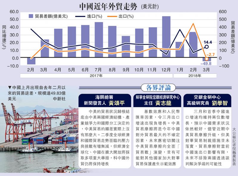 按美元計價,中國三月出口出現同比負增長2.7%,進口則較前值擴大8.1個百分點至14.4%,令上月出現自去年二月以來的貿易逆差,規模為49.83億美元。分析認為,基數效應和人民幣匯率因素,令上月出口增速出現負增長。海關總署新聞發言人黃頌平介紹,一季度外貿總體形勢仍較好,未來中國外貿進出口平穩運行將面臨一些挑戰,但綜合判斷,料二季度內地外貿進出口仍將保持增長。/大公報記者 倪巍晨