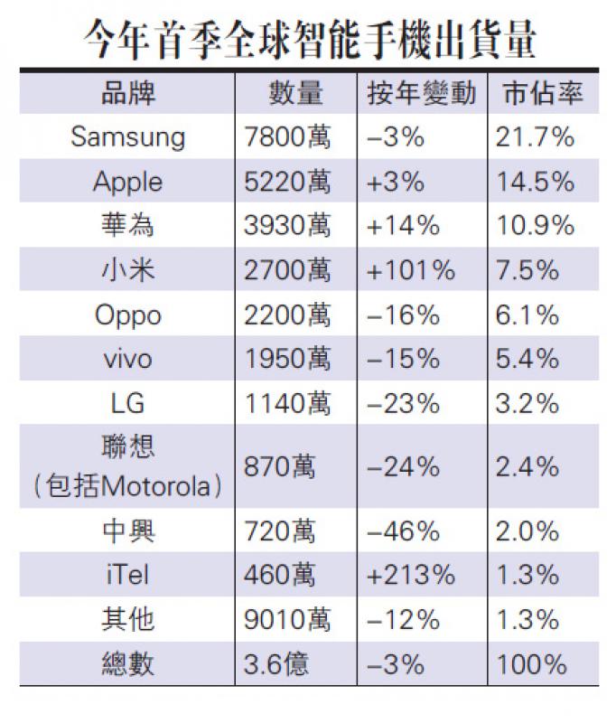 至於聯想集團(00992)旗下Lenovo及Motorola,首季合計出貨量僅870萬部,按年減少24%,市佔率由3.1%降至2.4%。近期備受中美貿易戰影響的中興通訊(00763),首季出貨量急挫46%至720萬部,市佔率由3.6%降至2%。