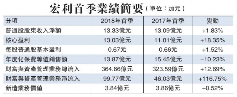 【大公報訊】記者邵淑芬報道:宏利(00945)宣布,2018年首季普通股股東收入淨額為13.33億(加元,下同),按年上升1.83%;核心盈利則上升18.35%至13.03億元。每股普通股基本盈利0.67元,派每股普通股股息0.22元。值得留意的是,新造業務價值按年錄得輕微倒退,跌0.52%至3.84億元;亞洲新造業務價值則增長1%至3.25億元。