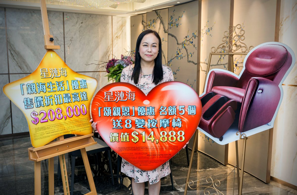 大公網5月7日訊(記者 梁穎賢)長實(01113)高級營業經理楊桂玲表示,旗下馬鞍山星漣海1200餘呎4房單位僅餘6伙,最快月底加價3至4%,不排除同時削減車位優先認購權。配合母親節,首5位4房戶買家於優惠期(5月11日至6月3日)內可獲贈按摩椅一張,價值14,888元。