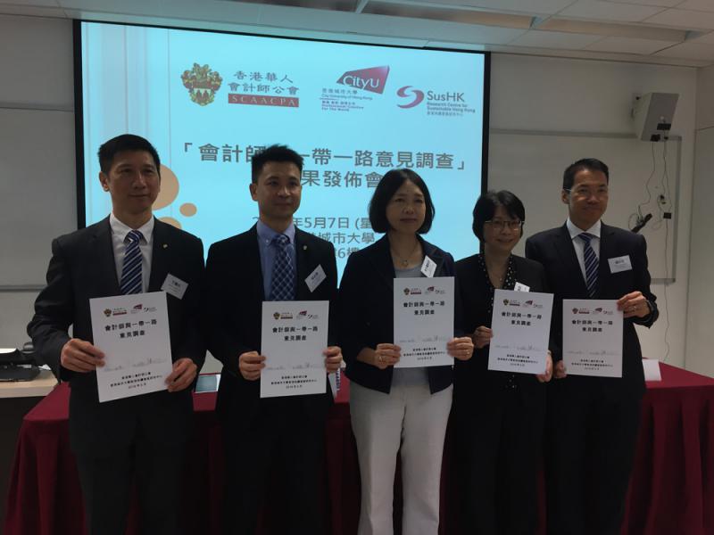 圖:香港華人會計師公會會長陳志興(左二),前會長甘耀成(左一),前會長楊志偉(右一),城大持續發展研究中心總監李芝蘭(中)及副總監巫麗蘭(右二)