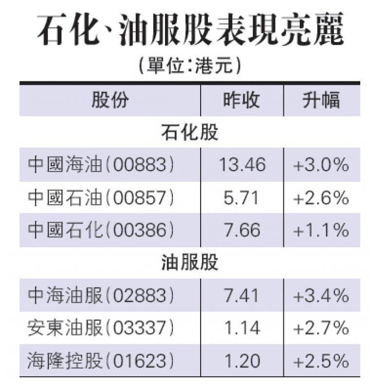 特朗普會否退出與伊朗達成的核協議,本周便有分曉。資金湧入石油期貨,國際期油昨日走強,紐約期油升穿每桶70美元心理關口;在香港掛牌的石化、油服股大漲。中國海油股價升3%,收報13.46元,是三年半以來高位;中國石油(00857)股價升2.6%,報5.71元;中國石化(00386)股價升1.1%,報7.66元。油服股跟漲,中海油服(02883)股價升3.4%,報7.41元;安東油服(03337)升2.7%,報1.14元。
