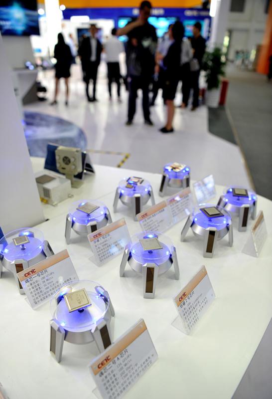 圖:圖為中國電子科技集團公司展台展示可供5G網絡信號使用的芯片\中新社