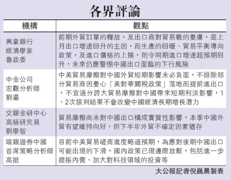 興業銀行兼華福證券首席經濟學家魯政委指出,隨着節日效應徹底消退,中國出口、生產節奏已趨正常化,前期外貿訂單的釋放及出口商對貿易戰的憂慮,是上月中國出口增速回升的原因;中國生產回暖、貿易平衡導向政策及進口價格上揚,促使上月進口增速超預期。中金公司劉鎏認為,四月數據顯示中國出口增速已回歸常態,對於四月外貿數據表現優於預期,他不排除是貿易商因憂心「美對華關稅政策」落地而提前開展進出口。