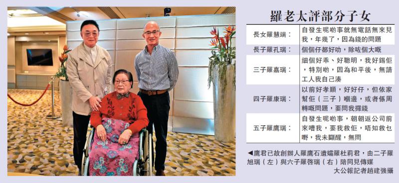 鷹君(00041)羅家「爭產」案雖已進入法律程序,創辦人羅鷹石遺孀、人稱羅老太的羅杜莉君仍選擇於母親節前夕見傳媒,點評一眾「唔聽話」的子女,包括「最錫」的三子羅嘉瑞為了爭權而令自己失望,四子羅康瑞因資金周轉的問題,而需要向家族借錢,而五子羅鷹瑞則「朝朝嘈我要我救佢」,令她有家歸不得。/大公報記者 趙建強
