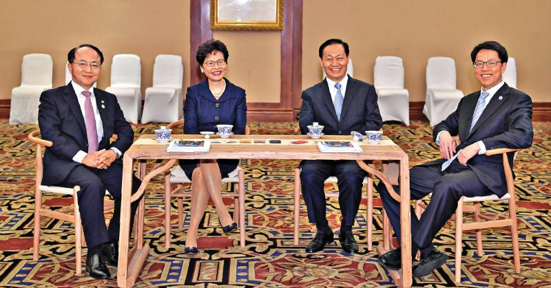 三任中聯辦主任彭清華(右二)、張曉明(右一)、王志民(右四),與特首林鄭月娥(右三)相聚成都