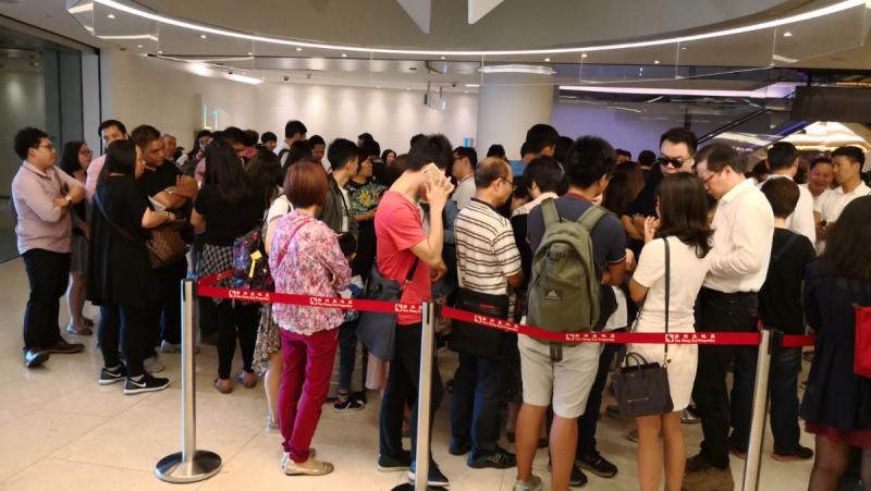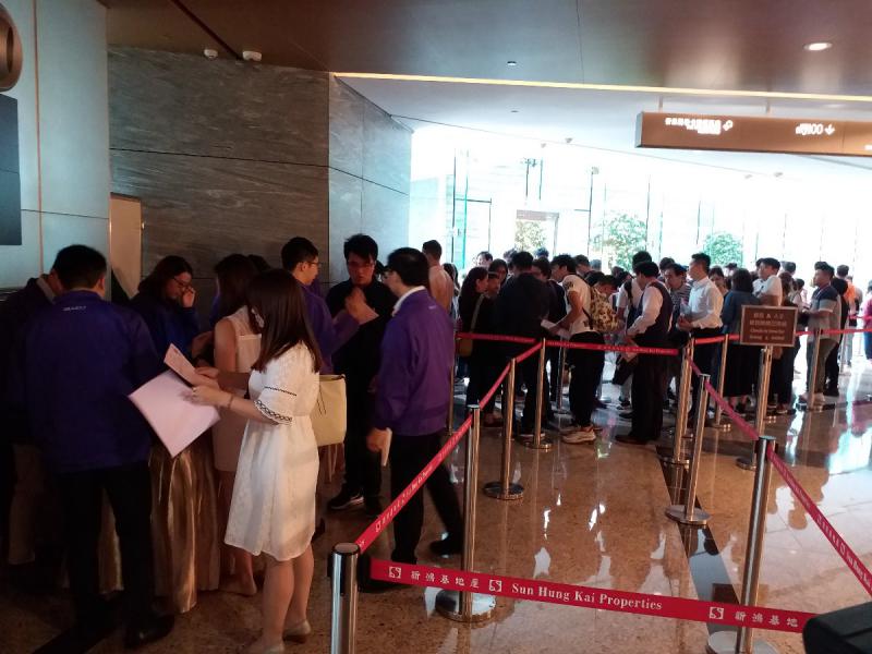 項目今早分A及B組兩輪揀樓,市傳A組錄得4枱客共掃入9伙,最大手一組以約1800至1900萬元買入3伙。其後輪到B組報到,人龍一度由大堂屈落下一層再兜一圈排落停車場,相當墟冚,估計高峰期過千人迫爆ICC(售樓處地點),大量一家大細手推嬰兒車及三代同堂到場揀樓,可見用家居多。