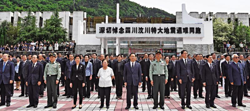 圖:四川省12日在汶川映秀舉行「5.12」汶川特大地震抗震救災十周年紀念儀式。中國婦聯名譽主席彭珮雲(前排左五)、香港特別行政區行政長官林鄭月娥(前排左四)、解放軍西部戰區司令員趙宗岐(前排右四)、西部戰區政委吳社洲(前排左三)、國務院港澳辦主任張曉明(前排右三)、香港中聯辦主任王志民(前排左二)出席了紀念儀式,四川省委書記彭清華(前排左六)出席並講話