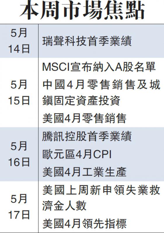恒指上周主板成交仍不足千億,僅999億元,仍處偏低水平。鼎成證券投資策略總監熊麗萍表示,本周大市焦點有三個,一是騰訊首季業績,二是MSCI公布納入A股名單,三是中美貿易問題。她指,上周恒指造好,恒指支持位可由29800點上調至30500點至30800點,但難突破32000點關口。此外,港股成交不夠,亦限制大市升幅。她指,港股要突破32000點關口,要看內銀及內險股價,故要看MSCI公布納入A股名單能否帶來刺激。