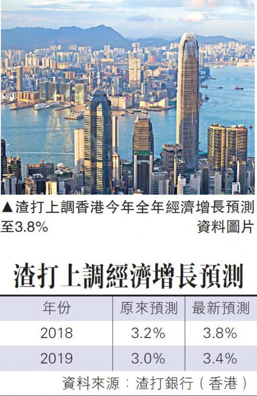 【大公報訊】記者黃裕慶報道:因應香港今年首季經濟增長勝預期,兩家銀行宣布上調對香港2018年全年經濟增長預測。渣打銀行(香港)的預測由原來的3.2%上調0.6個百分點至3.8%,華僑永亨銀行則由原來的2.9%上調0.7個百分點至3.6%。