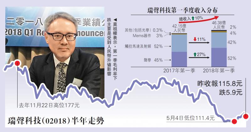 瑞聲科技昨日中午公布業績後,但市場似乎對業績「唔收貨」,股價隨即急跌,一度挫6.7%至113.6元,全日收報115.8元,跌4.8%或5.9元,成為昨日表現最差的藍籌股。