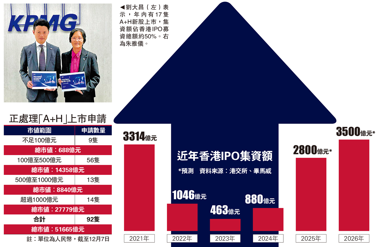 香港新股市場重拾動力。會計師行畢馬威預計,今年香港IPO集資規模有望超過2800億元,位居全球首位,明年有望進一步增至3500億元,保持三甲之列。畢馬威中國香港資本市場組主管合夥人劉大昌表示,目前有92隻「A+H」新股正排隊等待上市,總市值近5.2萬億元人民幣(約5.7萬億港元),大部分有望在2026年完成發行,繼續為市場註入動力。\大公報記者 蔣去悄