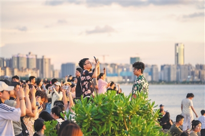 海口灣美麗的日落景觀吸引不少年輕人觀賞。海南日報全媒體記者 李天平 攝 盛夏時節,像氣溫一樣居高不下的,還有海南旅遊市場呈現出的