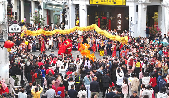 今天下午,一場年味十足的「龍獅賀春」民俗展演在騎樓老街舉行。伴隨着激昂的鑼鼓聲不斷,龍獅隊伍展示絕技,用「拿手好戲」徵服觀眾。