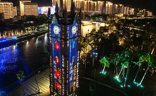 鐘樓在節日裏從未缺席,春節主題光影秀精彩開「秀」,體驗沉浸式5D光影構建的場景,熟悉的海口生活畫面輪番呈現,讓市民遊客充分了解海口文化,感受椰城的魅力。