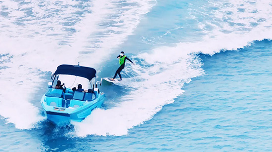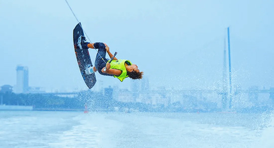 尾波衝浪是利用造浪艇在水中製造的尾浪,使衝浪者可以在類似海裏的大浪中衝浪。這項運動不僅考驗人的體力和膽量,還將給觀眾帶來極具視覺衝擊力的體驗。近年來,尾波衝浪成為海南旅遊的新興業態,吸引越來越多的國內外遊客前來體驗。