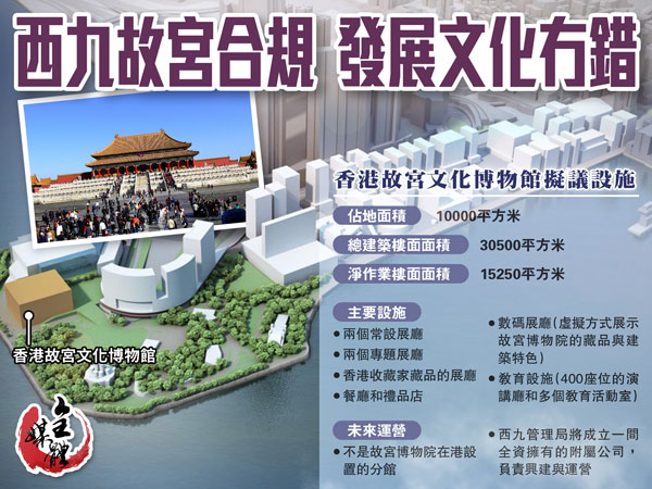 大公網1月6日訊 香港政務司司長林鄭月娥日前訪京時,宣布在西九文化區興建「香港故宮文化博物館」計劃,「故宮」建成後將展出由北京故宮博物院借出的約千餘件展品。