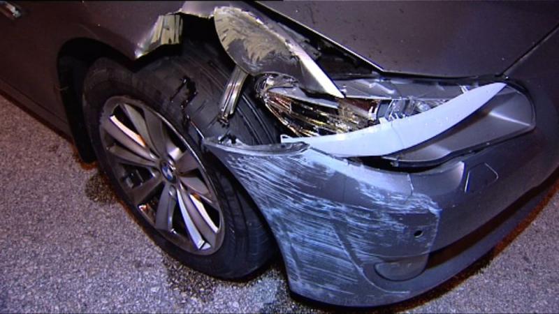 圖:警方隱形戰車被黑色七人車擦撞後車頭損毀/電視圖片