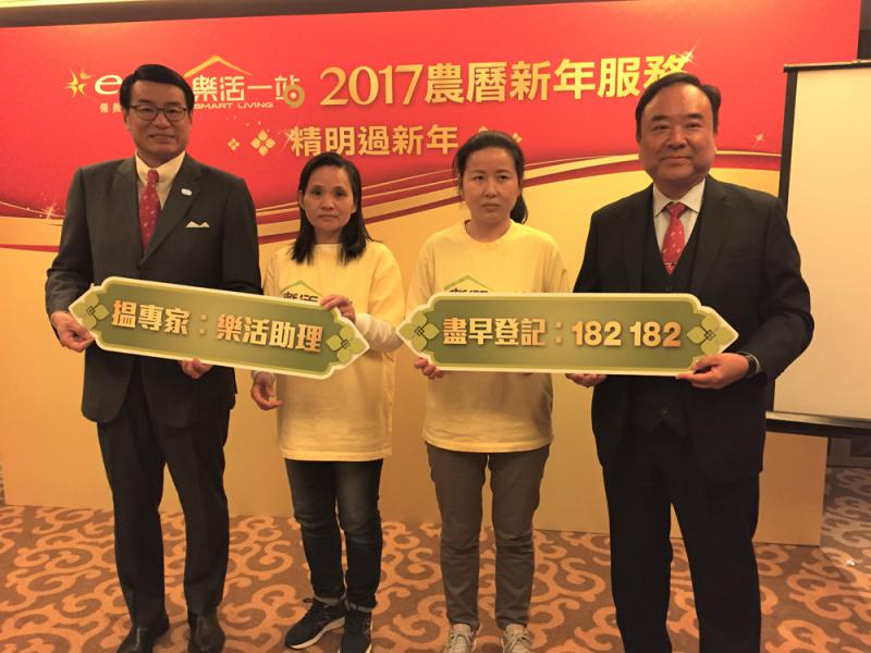 圖:僱員再培訓局推「樂活一站」農曆新年服務。左起:僱員再培訓局主席梁永祥、家務助理娟姐、家務助理李又林以及僱員再培訓局行政總監吳家光/大公報記者張月琪攝