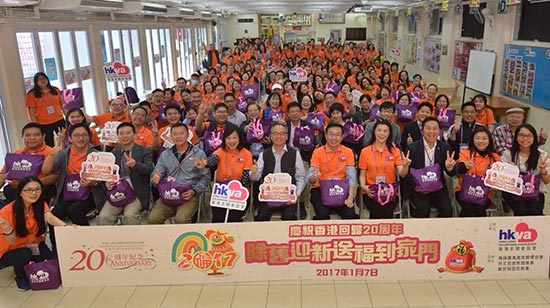 大公網1月7日訊(記者朱晉科)香港志願者協會今日舉辦「慶祝回歸20周年除舊迎新送福到家門」敬老活動,民政事務局局長劉江華、中聯辦九龍工作部部長何靖及青年工作部副部長楊成偉出席啟動禮儀式,並與200多名志願者一起上門派送福袋和探訪長者。