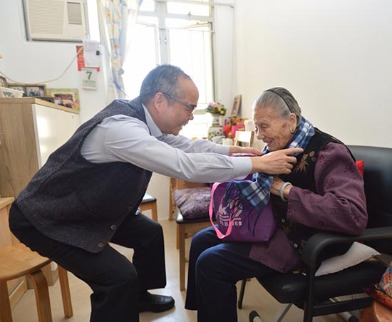 民政事務局局長劉江華為長者披上頸巾以示關懷