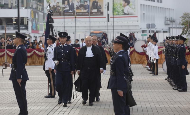 圖:法律年度開啟典禮在香港大會堂舉行,終審法院首席法官馬道立檢閱警察儀仗隊/ 大公報記者林少權攝