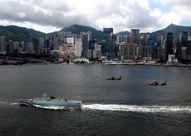 與此同時,三架武裝偵察、搜救直升機飛離駐港部隊石崗空軍基地,在對香港可疑目標進行空中偵察和巡檢後,空中直升機編隊進行超低空機動追蹤、空中特情處置等課目演練。