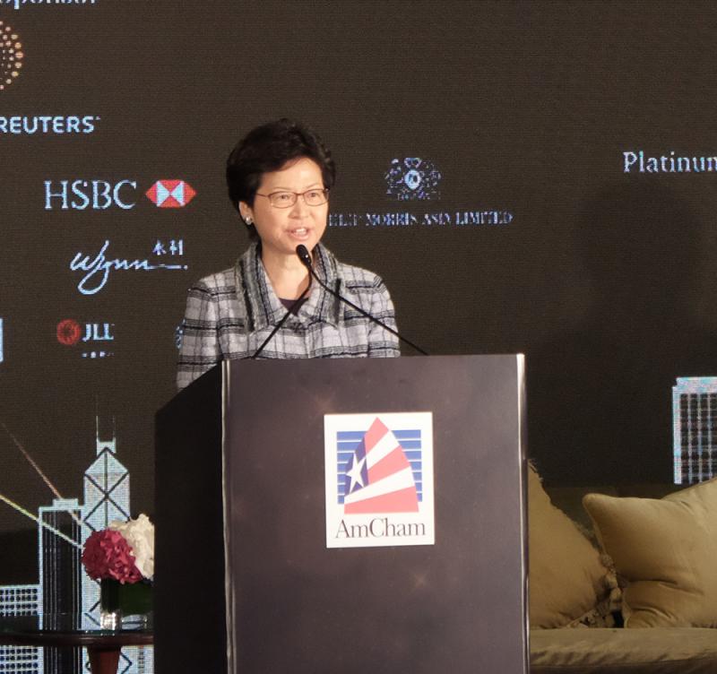 圖:候任行政長官林鄭月娥昨天在香港美國商會舉行的慶回歸酒會上致辭