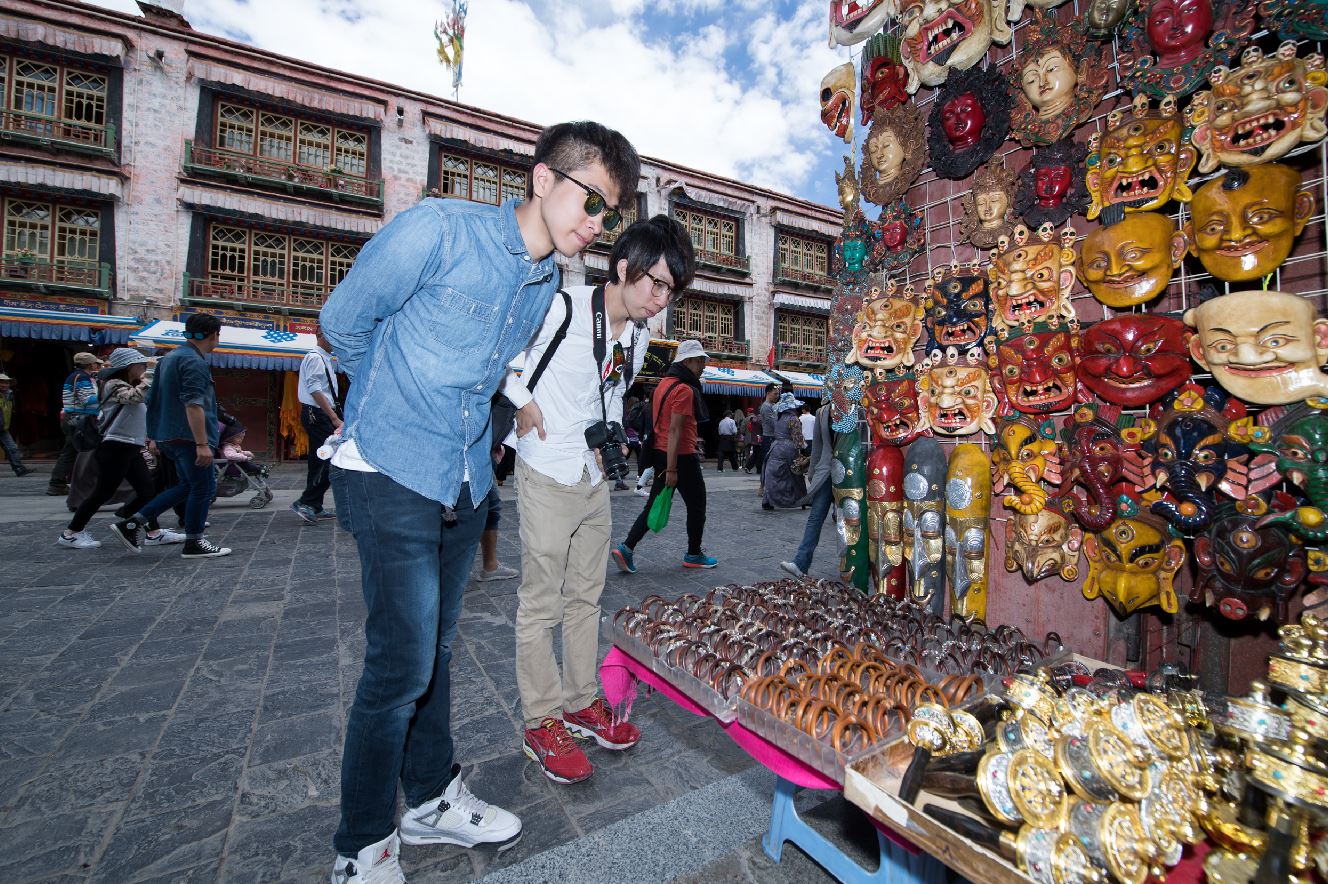 學生們在八廓街駐足欣賞西藏特色旅遊紀念品