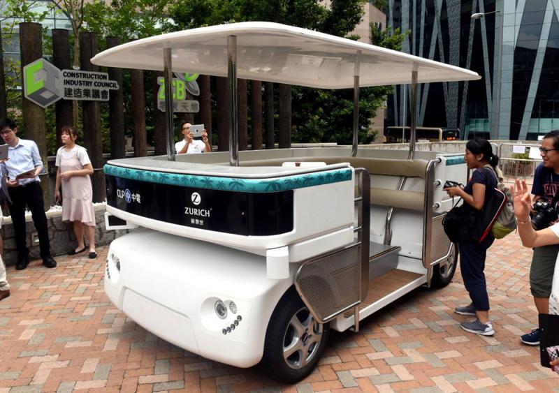 圖:體驗館展出全港首部無人駕駛電動車\中通社圖