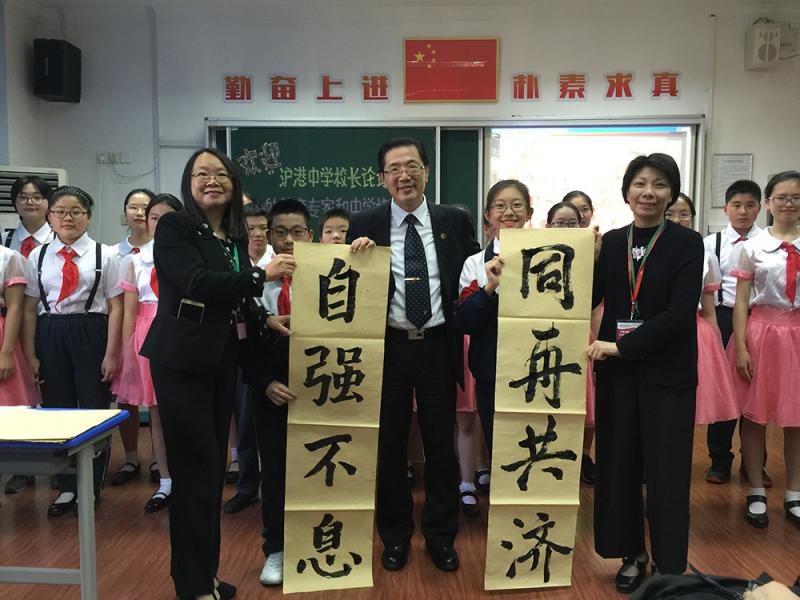圖:漢字讓兩地人瞬間都感受到一份濃濃的血脈親情。圖為香港中學校長參觀上海七一中學並贈禮物\資料圖片