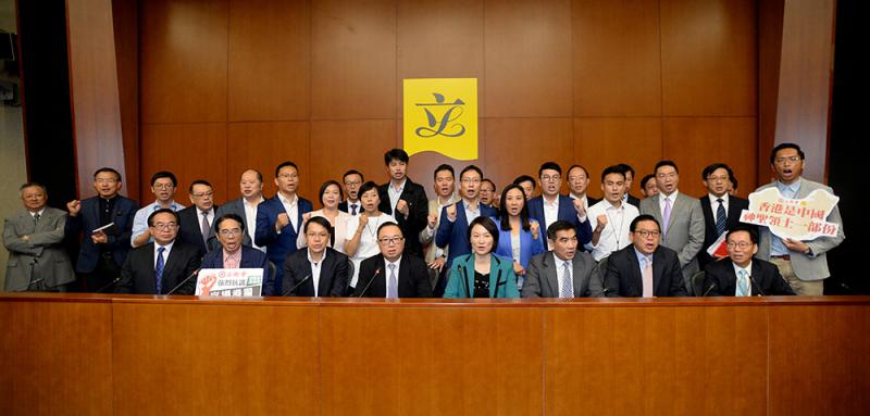 圖:去年十月,廖長江(前排左四)與建制派議員一起召開記者會,譴責梁頌恆及游蕙禎在誓詞中播「獨」辱華