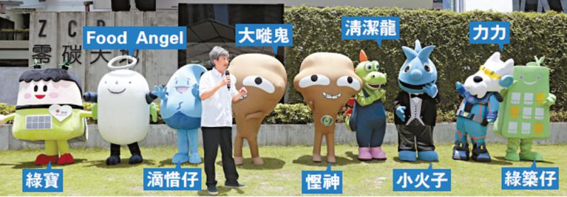 身為主角企中間,但大家又分唔分得清,邊隻先係大嘥鬼?畀提示你喇,大嘥鬼特徵係眼闊肚窄兼盞鬼,肚上有個「電源開關掣」係環境局「慳神」。大嘥鬼再隔籬嘅係水務署嘅「滴惜仔」,另外兩隻係惜食堂「Food Angel」,同埋港燈綠得開心大使「綠寶」。