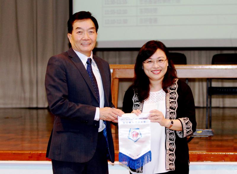 圖:聖公會蔡功譜中學校長林玉琪(右)致送紀念錦旗予崔康常(左)
