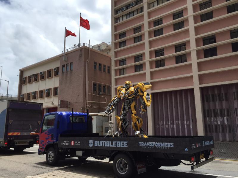 大公網6月12日訊 (記者龔學鳴報道)知道今日下午會有八號波,都無咩心機返工。不過呢,係雷電交加、狂風暴雨嘅前夕,香港嘅天氣異常晴朗,所謂暴風雨前夕總係最平靜嘅。再望返地面,咦,無眼花嘛?竟然係鰂魚涌見到大黃蜂,仲要被人綁住係柯柏文貨車上面?根據目測,大黃蜂身高兩米半,而柯柏文貨車亦長約六米。係鰂魚涌出現係咪因為上一集係鰂魚涌取景呢?