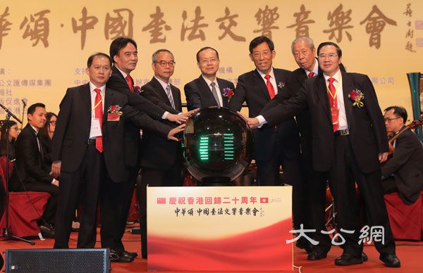 香港中聯辦副主任楊健(中),香港民政事務局局長劉江華(左三),香港大公文匯傳媒集團董事長姜在忠(右三),全國政協文史委員會原副主任、中國書協香港分會主席施子清(右二)等出席「中華頌——中國書法交響音樂會」(大公文匯全媒體記者麥鈞傑攝