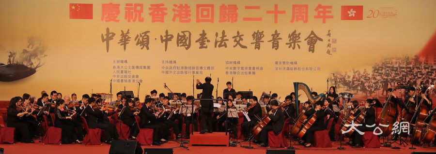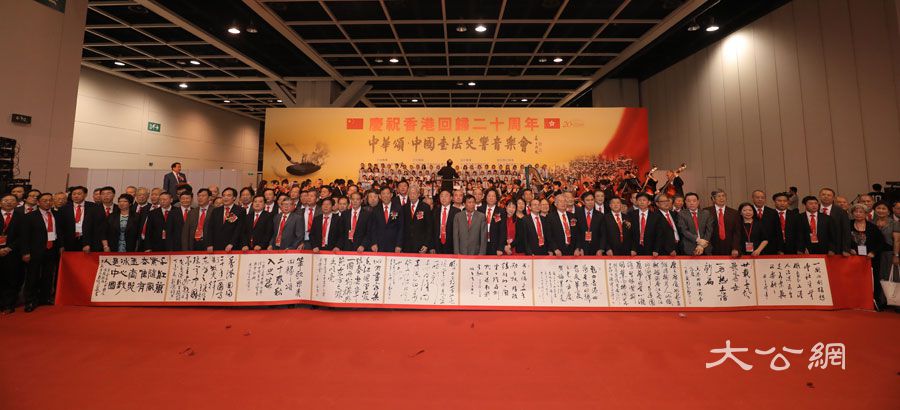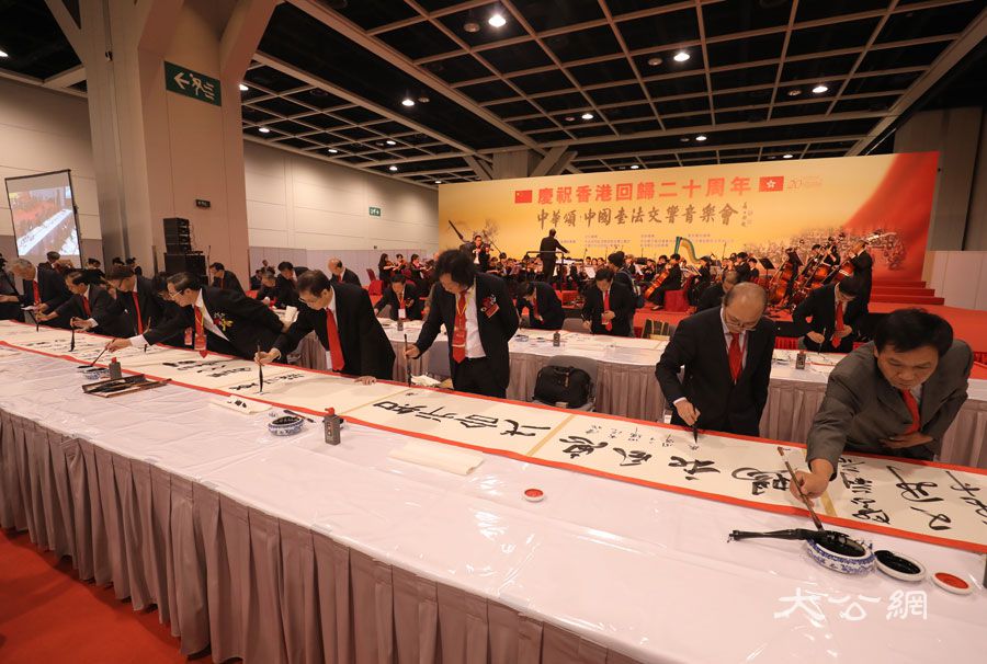 音樂會上演唱演奏了《東方之珠》、《龍的傳人》、《我是中國人》、瑤族舞曲《小河淌水》等經典曲目。書法家們登台共舒長卷,在近一個小時的時間裏,先後有內地60位書法家、香港22位書法家、台灣15位書法家、澳門7位書法家共104位書法家參與創作長卷。活動最後,現場各界嘉賓、書法家走上舞台與香港學生合唱團共唱《歌唱祖國》,將此次活動推向了高潮。逾百位著名書法家相聚在九七香港回歸大典的舉辦地香港會展中心,揮毫潑墨,祝福祖國,表達了對香港明天的美好祝願。