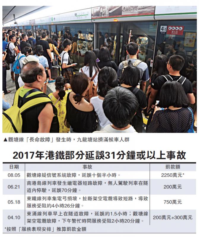 連同昨日觀塘線信號故障,昨日已是港鐵九日內第五宗列車延誤事件,於上月28日至30日荃灣線接連發生供電及信號故障,前日港島線堅尼地城與西營盤站之間亦出現信號故障。根據港鐵與特區政府達成的服務表現安排,就今次觀塘線故障發生至完全修妥,所需的時間初步估計,港鐵有機會罰款約2250萬元(見資料表),接近單一事故中罰款2500萬元的上限。