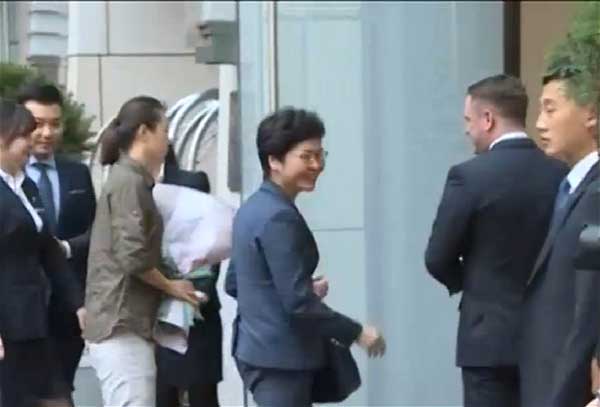 林鄭月娥抵達下榻酒店。(電視新聞截圖)
