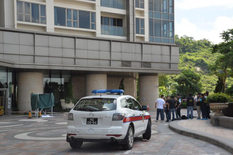 圖:大批澳門司警人員在港男與兩歲女墮樓現場調查