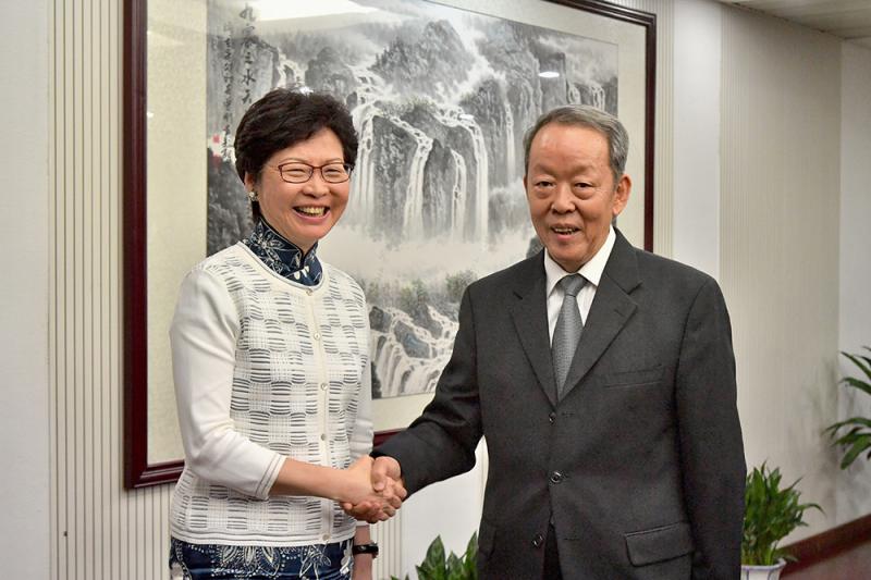 圖:林鄭月娥昨日下午在北京與國務院港澳辦主任王光亞會面 中通社