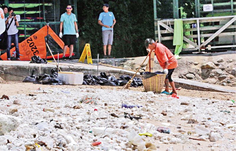 《大公報》記者昨午在聖士提反灣現場所見,灘上懸掛紅旗,有通告及現場廣播封灘消息。救生員如常當值,不少泳客抵埗始知封灘,索性在沙灘上享受日光浴。惟白色油污隨海浪沖上泳灘,形成大小不一的粒狀,最大的有浮波般尺寸。數名外判清潔工在烈日下,不停俯身把油污掃入垃圾袋。記者目測,現場放滿棕櫚硬脂的垃圾袋逾數十袋。有救生員划艇出海,在防鯊網一帶加設吸油條。