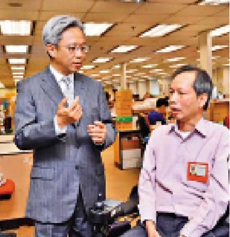 圖:羅智光(左)在稅務局與殘疾同事交談