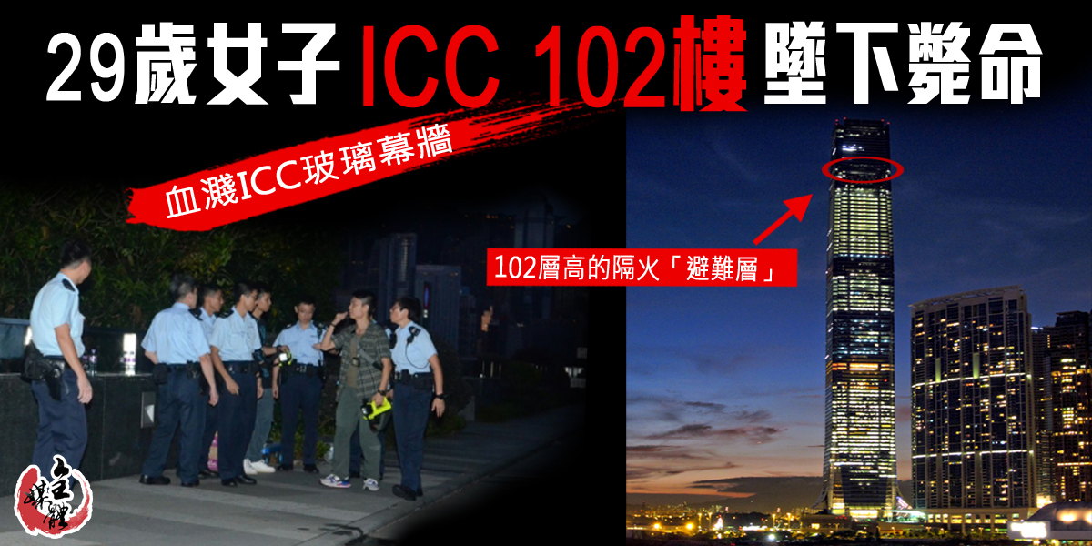 今日(8日)凌晨3時許,一名29歲姓廖女子被發現倒斃在香港環球貿易廣場(ICC)旁的馬路上。警方初步懷疑,該女子是從102層高的隔火「避難層」位置一躍而下。由於大廈為上窄下闊設計,該女子墜樓時壓中10餘樓凸出的玻璃窗,繼而反彈出的士站外馬路殞命。警方正調查其墜樓原因。