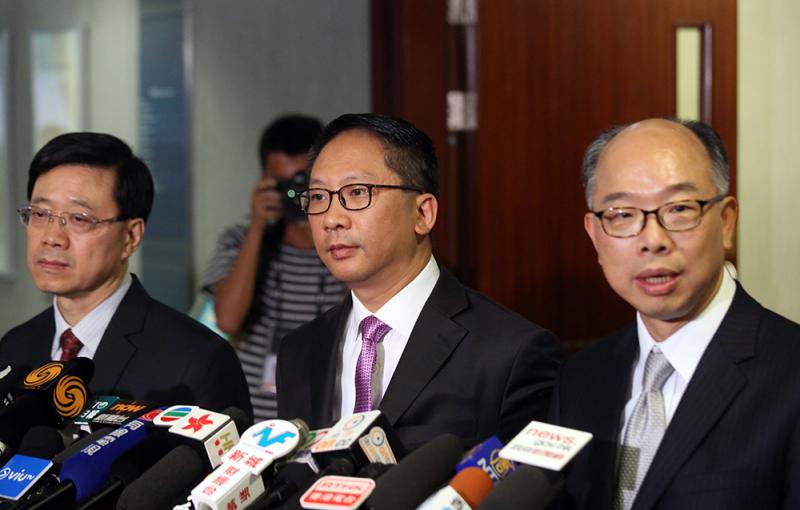 圖:律政司司長袁國強(中)重申,西九龍總站實施「一地兩檢」是符合常理及具必要性/大公報記者黃洋港攝