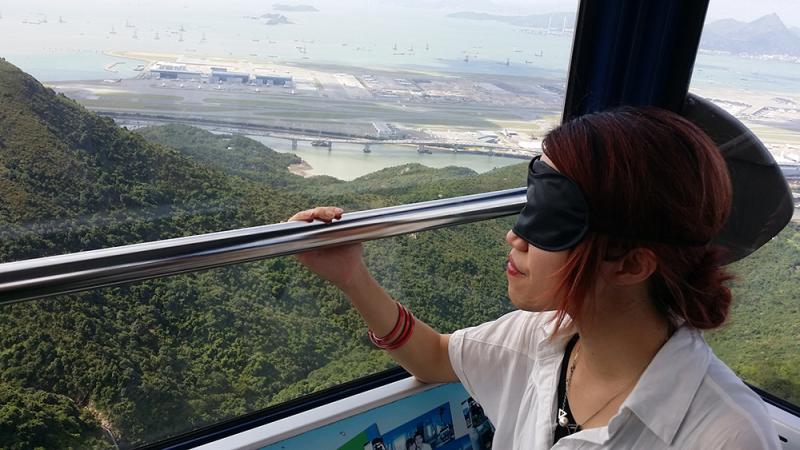 圖:蒙眼搭纜車可以了解視障人士生活/大公報實習記者鄧淑姿攝