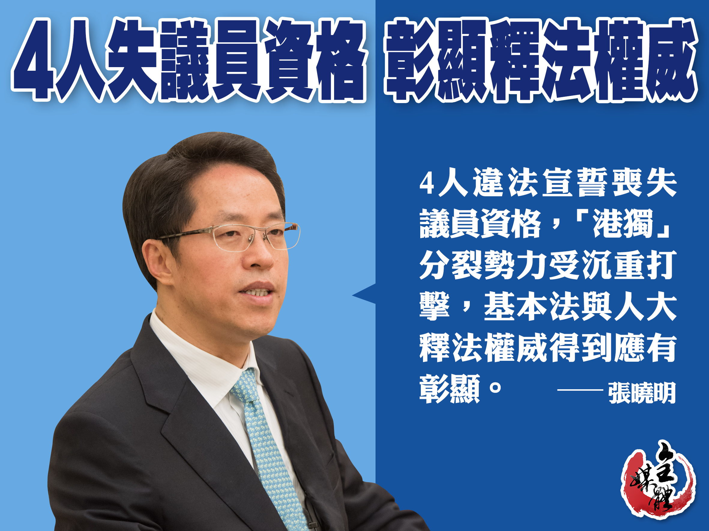 大公文匯全媒體綜合報道:今日(9日),香港中聯辦主任張曉明在出席「香港同胞慶祝中華人民共和國成立68周年籌備委員會」成立大會時表示,4名宣誓違法的人被判喪失立法會議員資格,使「港獨」分離勢力受沉重打擊,基本法與全國人大釋法權威得到應有彰顯。