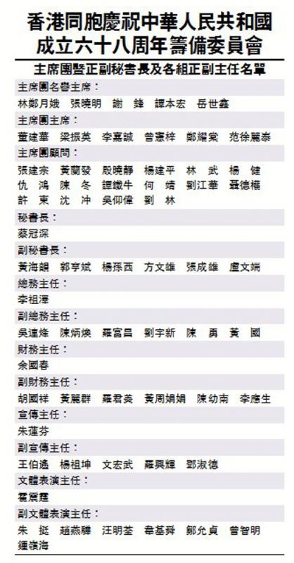 籌委會秘書長蔡冠深介紹活動具體內容,他指,籌委會定於10月1日晚上七時舉行「香港同胞慶祝中華人民共和國成立68周年文藝晚會」,演出時間為1小時15分,通過不同節目環節,以多種藝術表演形式,包括音樂,舞蹈,歌唱等表達對祖國成就的喜悅,並展望將來,一起攜手共建更美好的中國夢。