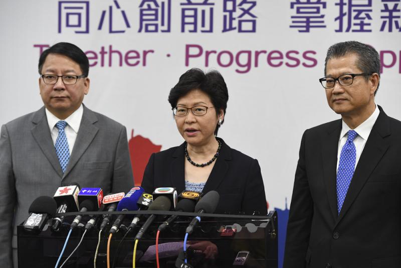 圖:行政長官林鄭月娥(中)在特區政府駐京辦總結此次訪京行程\中新社