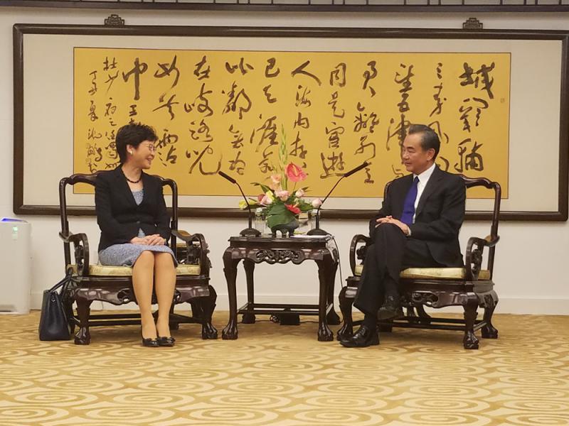 圖:林鄭月娥與外交部部長王毅(右)會面